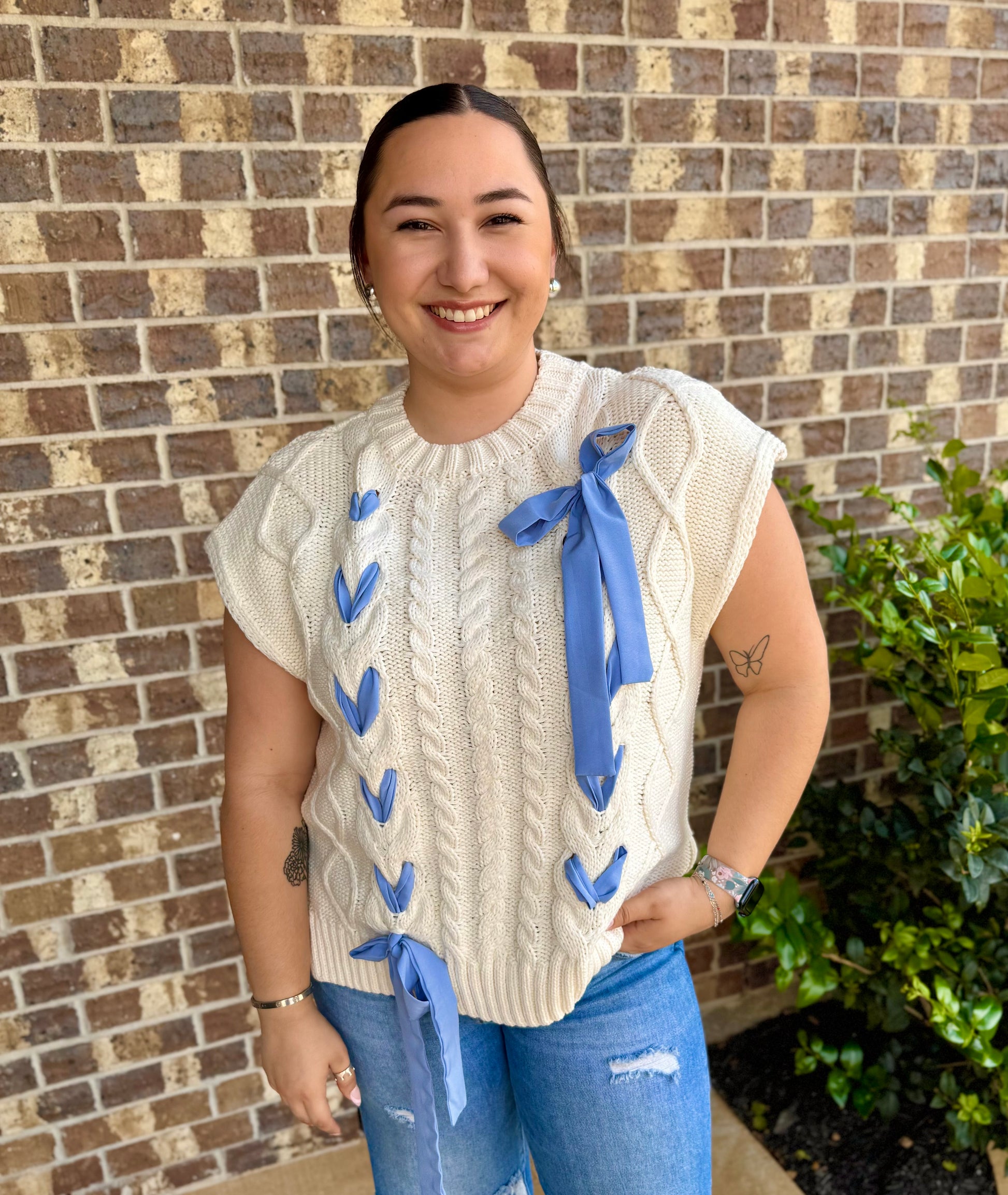 Introducing Grace Sweater, the perfect combination of cozy and cool. This sweater vest features a unique blue lace up detail that adds a fun twist to your everyday look. Stay warm and stylish with Grace Sweater.