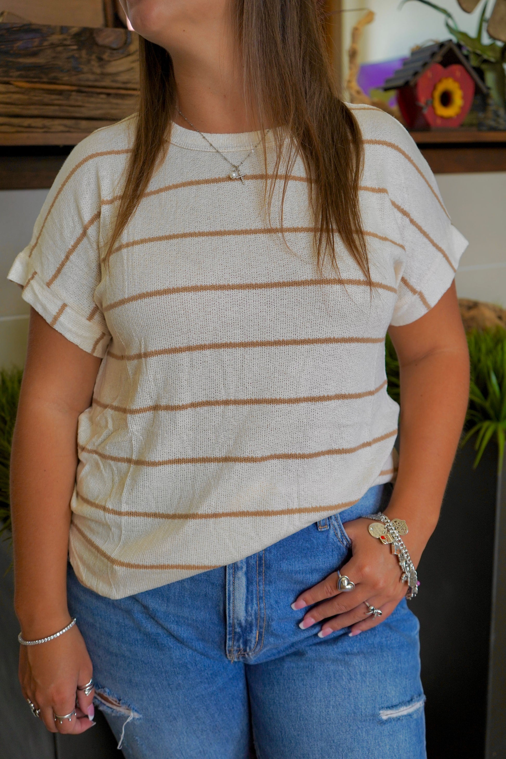 The Harper Top features a lightweight, knit-like fabric that offers exceptional softness for all-day comfort. Its cream and beige stripe design adds subtle elegance, while the short sleeves make it perfect for layering or warm weather wear. Ideal for those seeking a blend of style and comfort in a versatile top.