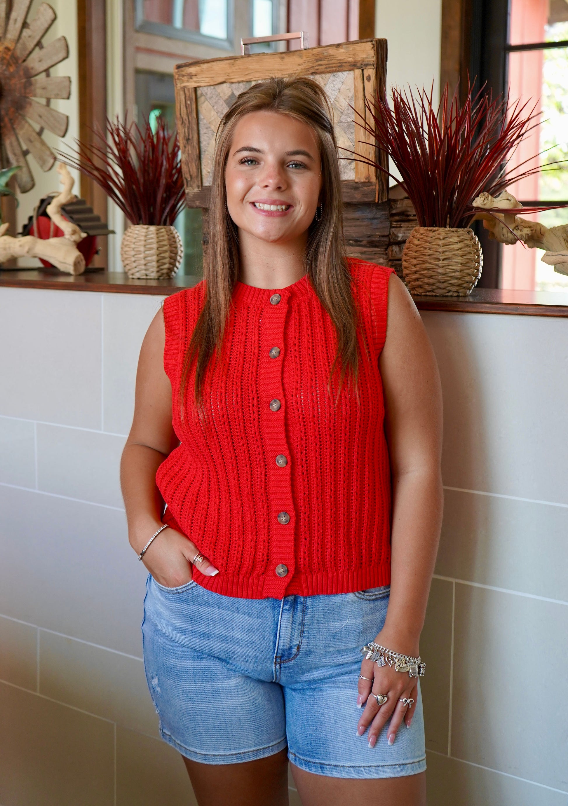 The Ivy Sweater Vest offers a timeless design in classic red or white, featuring a front button closure for easy layering. Its simple, versatile style makes it an essential piece for elevating both casual and professional outfits with expert ease. Crafted to provide comfort and adaptability, this vest seamlessly integrates into any wardrobe.